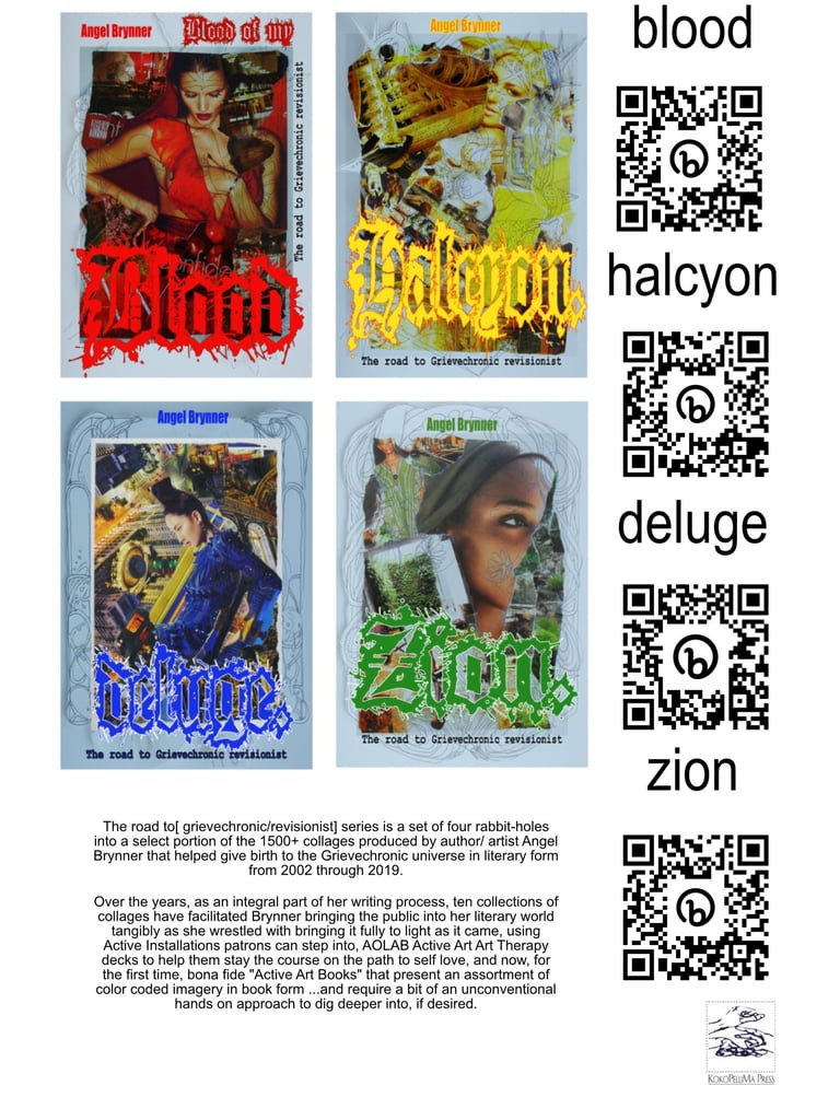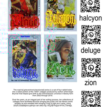 The Grievechronic/revisionist active-art book series is a rabbithole into a select portion of the 1500+ collages produced by author/ artist Angel Brynner that helped give birth to the Grievechronic universe in literary form from 2002 through 2019.
